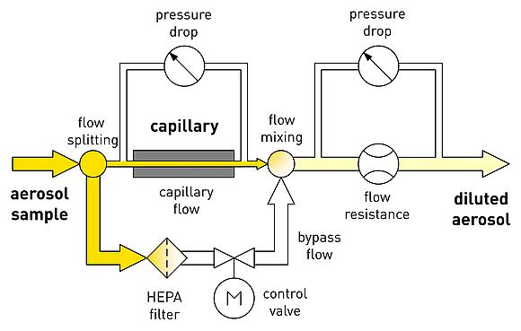 The DDS 560/C principal of operation is based on a splitting of the aerosol sample flow rate into a bypass and a capillary flow rate. All particles within the bypass flow rate are removed by a HEPA filter. The capillary flow is substantially lower than the bypass flow. Both the capillary flow rate and the total flow rate are determined via pressure drop measurement.