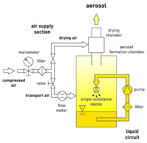 The aqueous suspension to be aerosolised (aerosol substance) is dispersed by a one-substance nozzle within the aerosol formation chamber of the ATM 240/S. The supplied liquid flow disintegrates and forms a broad distributed (polydisperse) droplet aerosol (primary aerosol). Due to inertia and gravitational settling, too large droplets leave immediately the primary aerosol after generation. A dry purge air flow, which is fed into the aerosol formation chamber, transports the remaining airborne droplets into the dip tube and initiates contemporaneous the process of droplet drying. To ensure a drying stable test aerosol, the aerosol passes prior leaving the generator an implemented drying section.