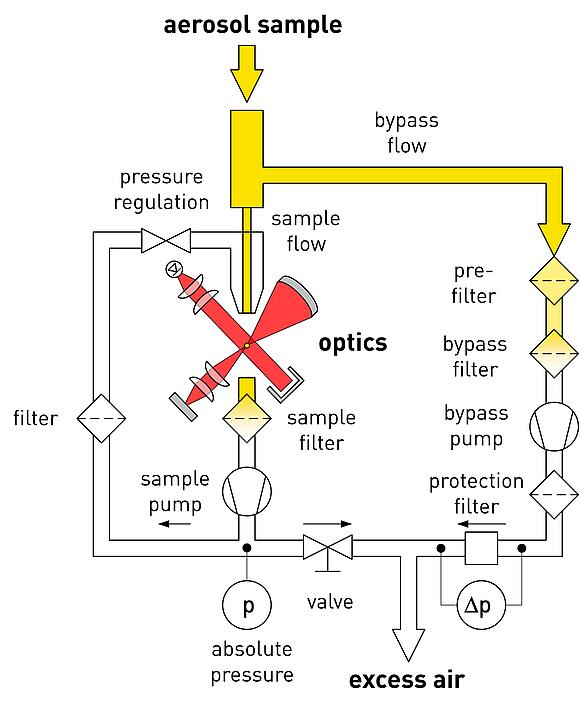 The LAP 322 aerosol spectrometer underlies the principle of light scattering. According to size of a particle passing the measuring volume scattered light occurs that is mapped on photo detector situated in 90° direction. Change of collected light at the photo detector is a measure of particle size and is subject to multi channel analysis.