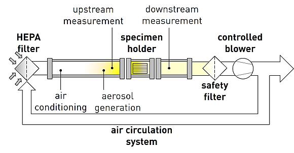 A defined volume flow rate is sucked through a HEPA intake filter, the attached test duct and the safety filter. The test system is composed of 6 sections: aerosol inlet, upstream measurement, specimen holder, downstream measurement, safety filter and flow rate measurement. The measurement sections are equipped with ports for the aerosol characterization and the determination of the pressure drop.